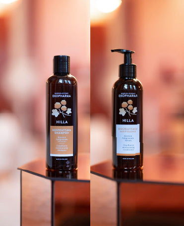 Ekopharman Hilla Lahjapakkaus pitää sisällään suositun Hilla Kosteuttavan Shampoon ja Hoitoaineen.