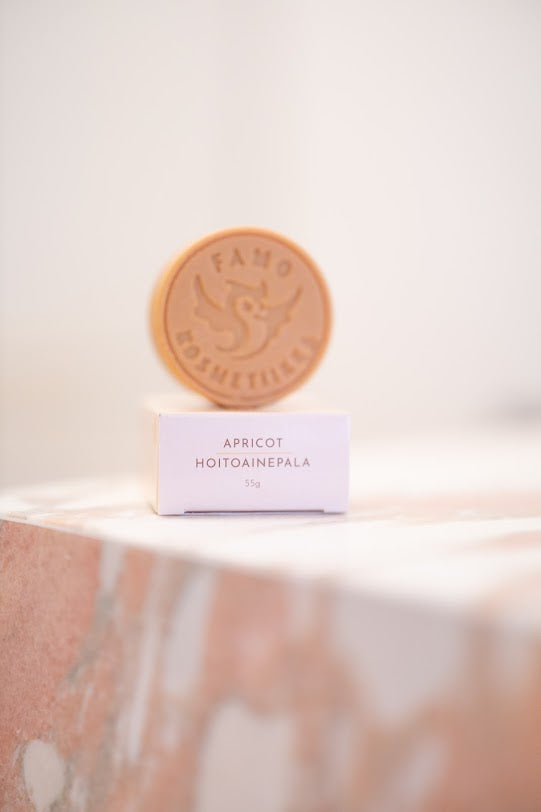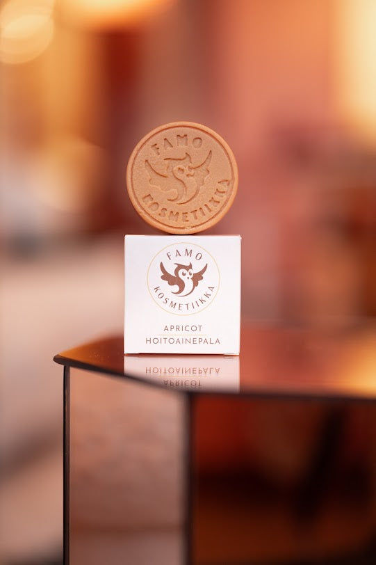 Aprikoosi hoitoainepala sisältää kosteuttavan aprikoosin siemenöljyn ja mangovoin lisäksi keltaista mineraali savea.